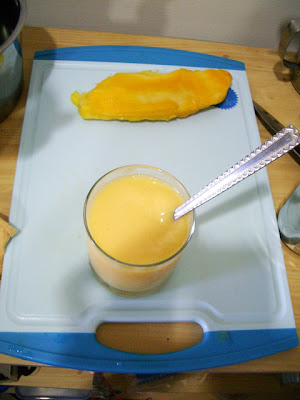 炙熱的夏天來杯新鮮的芒果冰沙是消暑的好妙方,剛好媽媽與小阿姨來,就自己DIY做了芒果冰沙請她們吃 材料:新鮮金皇芒果一顆牛奶少許冰塊一包 將芒果去皮切塊後置入調理機內,加點少許的牛奶,再將冰塊置入,啟動開關 大功告成^^ 吃起來清涼綿密,真是透心涼阿^^ 冰箱裡還有一罐池媽媽的桑甚,下回再來DIY桑葚冰沙...